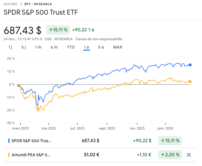 ETF non hedgé : Le S&P 500 a progressé d'environ 13% en dollars. L'euro s'est déprécié de 20% face au dollar. Rendement total : environ +35,6% (performance de l'indice + effet change).