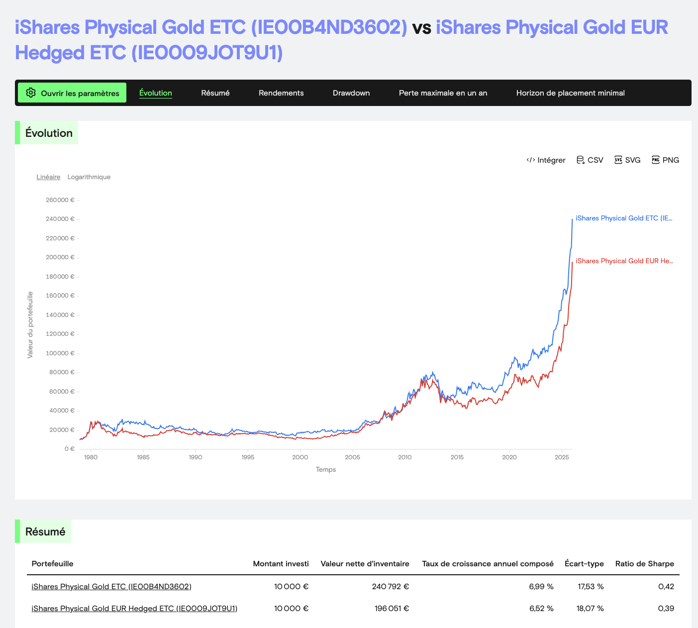 Les produits comparés ne sont pas parfaitement identiques (frais, méthode de réplication, fiscalité, tracking error), donc l’écart observé ne reflète pas uniquement l’effet de la couverture. Sur le long terme, la couverture de change n’est pas gratuite : le carry (différentiel de taux) et le renouvellement (“roll”) des contrats de couverture peuvent créer une ponction récurrente. Sur plusieurs décennies, un ETF hedgé peut donc finir avec une performance inférieure à un ETF non hedgé, même si la volatilité à court terme est plus faible.